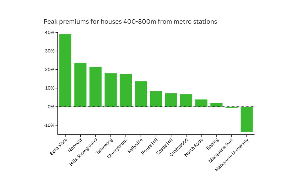 분석 결과, 벨라비스타(Bella Vista) 지역에서는 역에서 400~800미터 이내 주택의 가격이 39% 상승했으며, 노르웨스트(Norwest)에서는 23.6% 상승했다. 반면 에핑은 단 2%의 상승에 그쳤다.