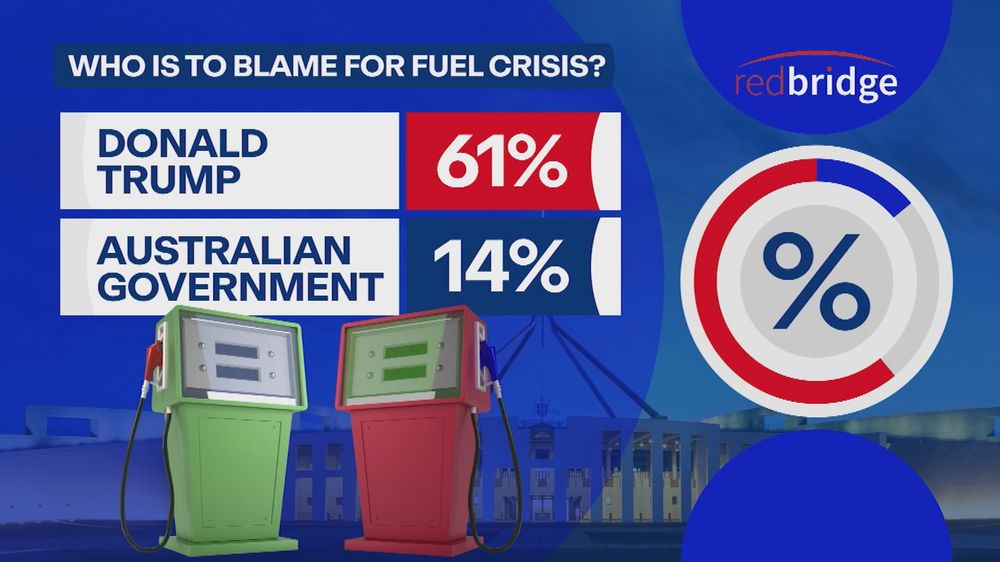 The Australian Financial Review/Redbridge Group/Accent Research 여론조사에 따르면 응답자의 61%가 최근 유류 가격 급등의 책임이 도널드 트럼프에게 있다고 답했으며, 정부에 책임이 있다고 응답한 비율은 14%에 불과한 것으로 나타났다.